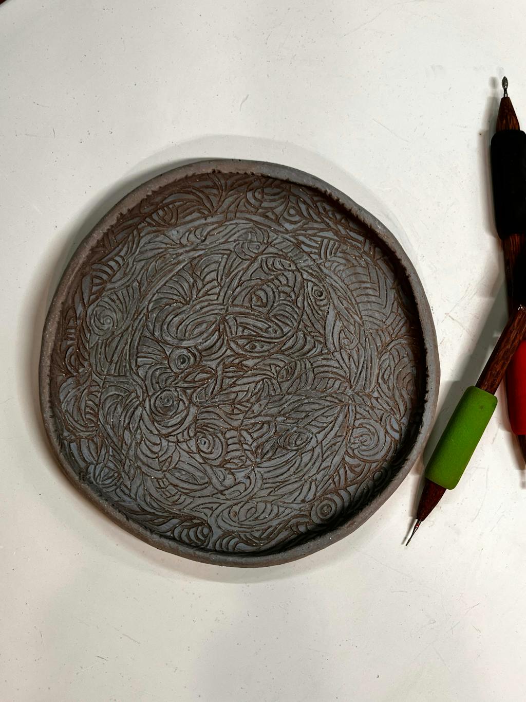 - Fine sgraffito detailing on dry clay